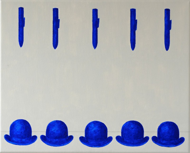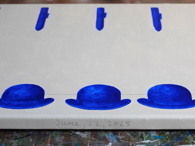 Ein Bowlerhut steht für Persönlichkeit und Würde. Die Reihe von Bowlerhüten am unteren Rand des Gemäldes symbolisiert eine Mehrzahl von Menschen. Die Reihe von Bomben (GBU-57) ganz oben im Gemälde stellt die Bedrohung durch technologische Überlegenheit dar. Gerade ist es statisch, doch in der Vorstellung kommt der Tod als Möglichkeit in Betracht. Das Datum an der unteren Bildkante „June, 22, 2025“ ist das vom Angriff der USA auf die Atomanlagen im Iran.